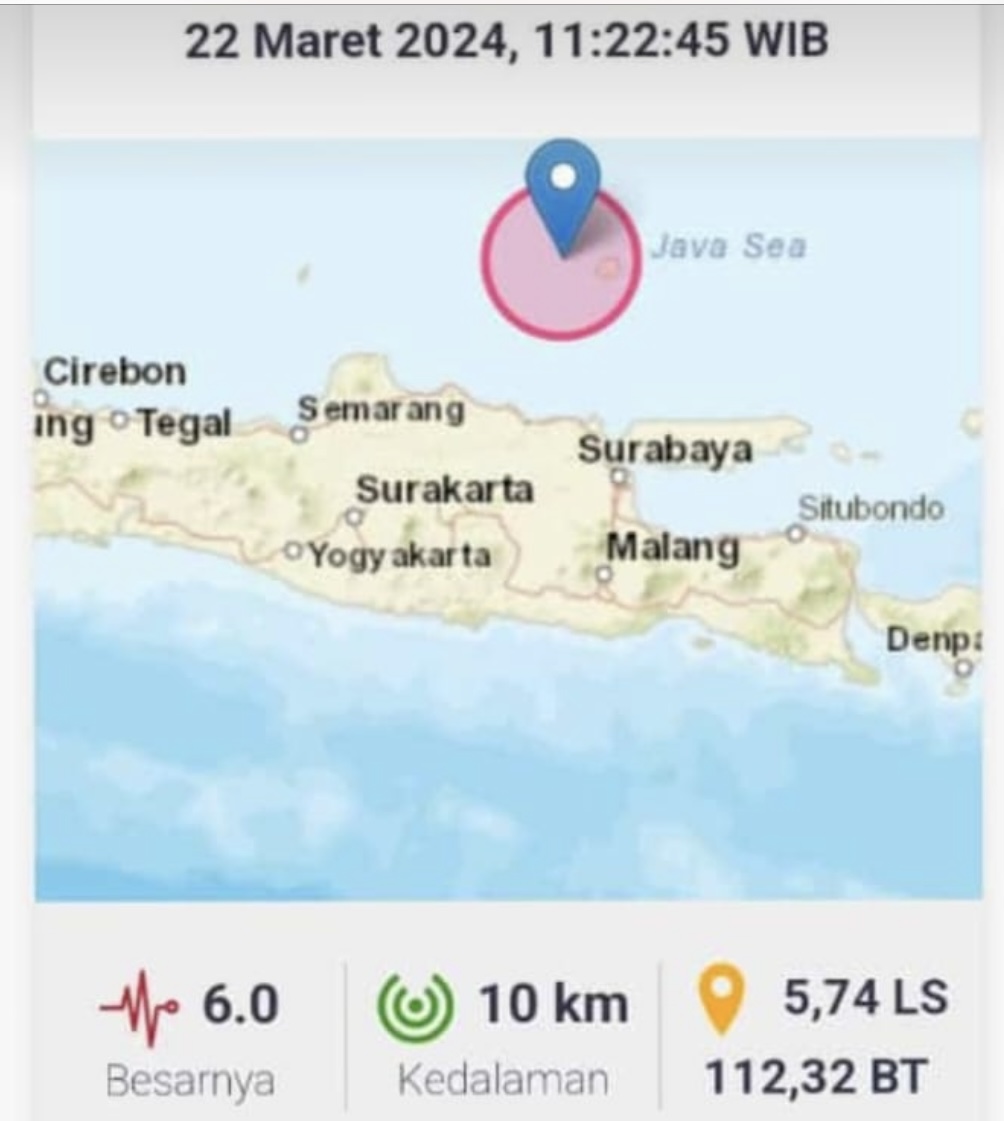 Gempa terasa sekitar pukul 11:22:45 WIB, Jumat (22/3/2024). "Info Gempa Mag:6.0, 22-Mar-24 11:22:45 WIB, Lok:5.74 LS, 112.32 BT (132 km TimurLaut TUBAN-JATIM), Kedlmn:10 Km ::BMKG, " demikian laporan Badan Meterigi melalui akun Twitter @BMKG.