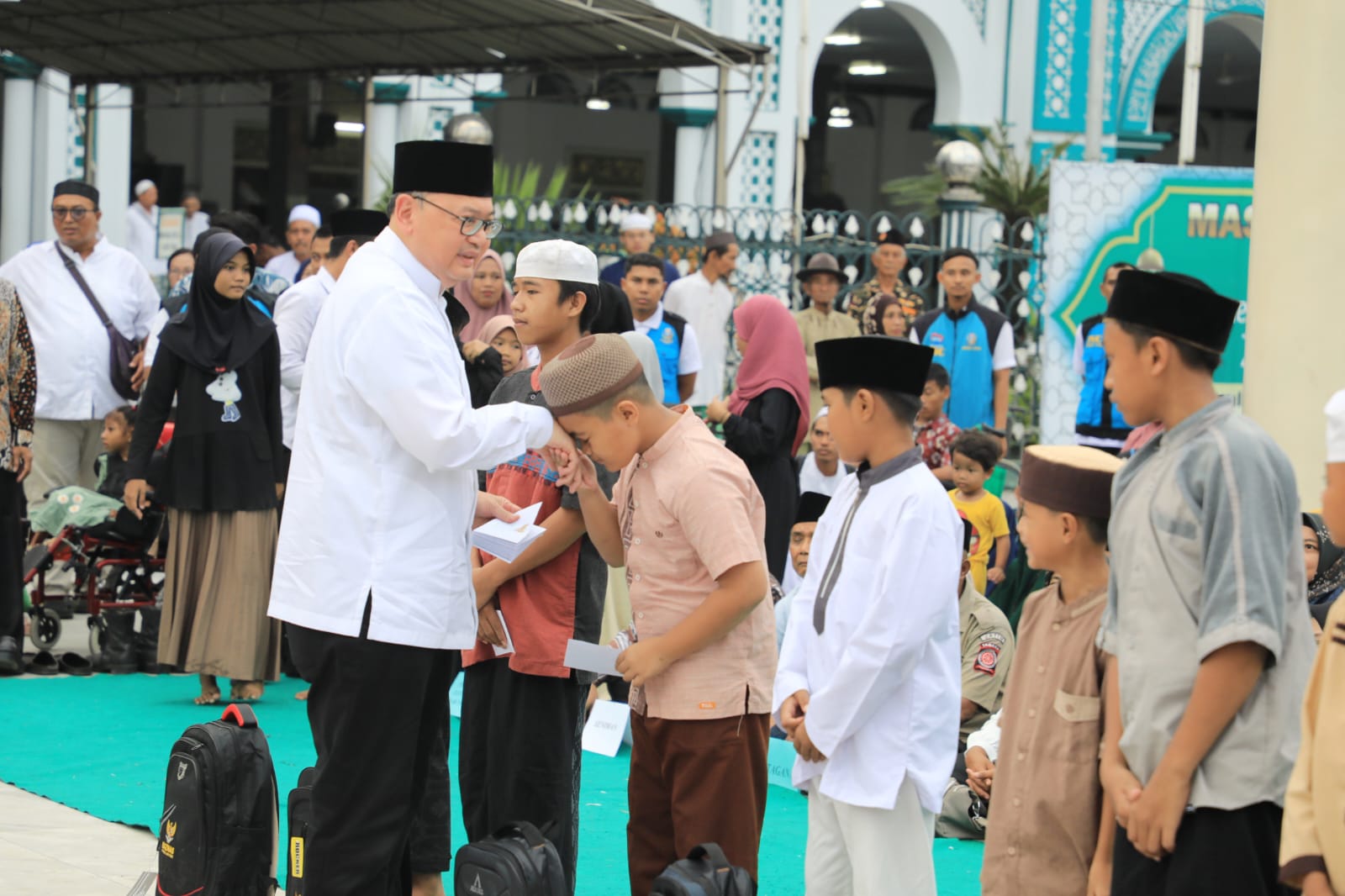 KANALSATU - Penjabat (Pj) Sekretaris Daerah Provinsi Jawa Timur Bobby Soemiarsono menyerahkan santunan kepada 1.000 anak yatim se-Kota Pasuruan di Halaman Masjid Agung Al Anwar, Kota Pasuruan, Sabtu (6/4/2024).
