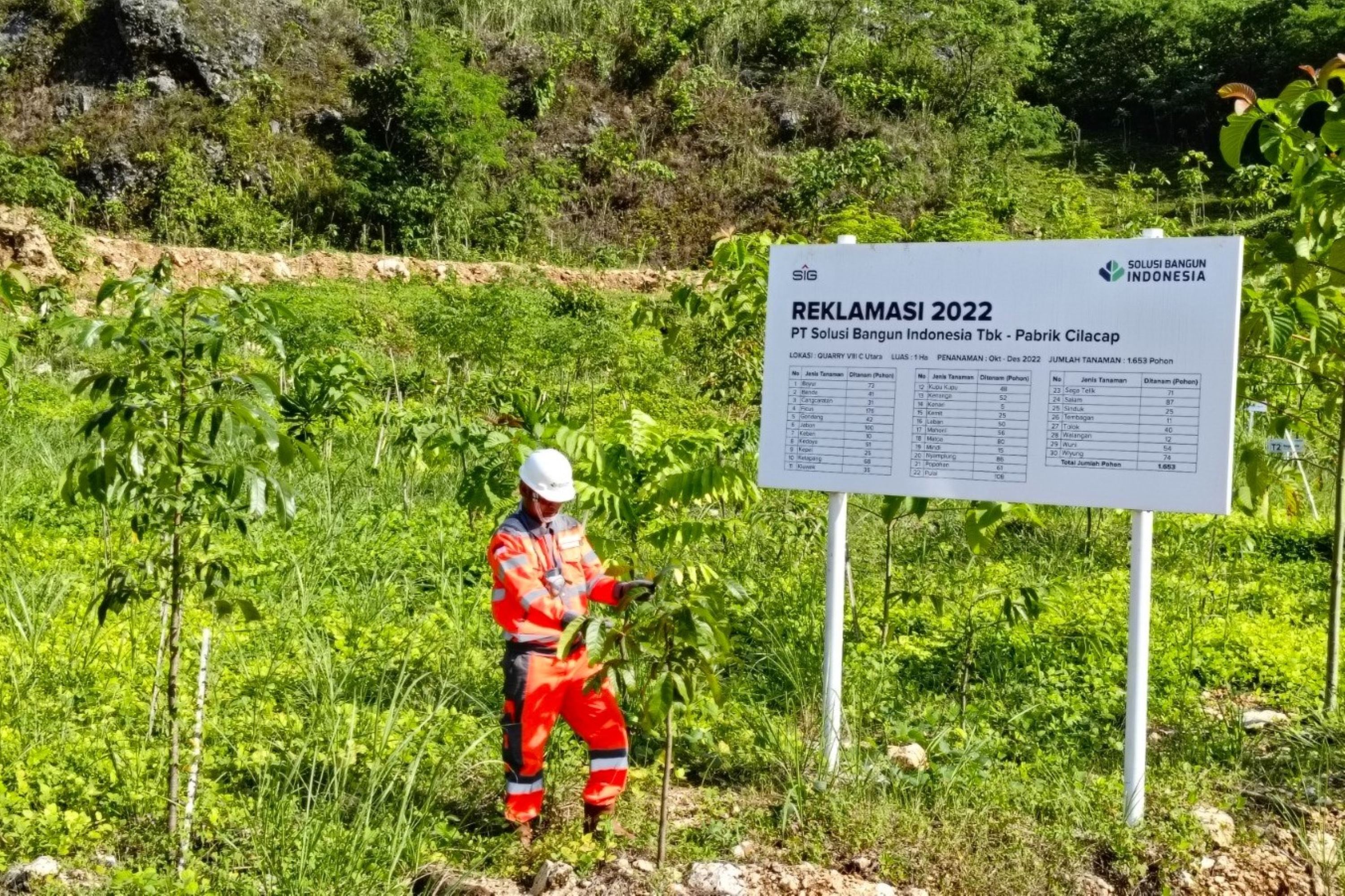 Sementara pada aspek lingkungan, hingga saat ini SBI Pabrik Cilacap telah melakukan reklamasi seluas 110,81 hektare pada lahan pascatambang batu gamping di Nusakambangan dan lahan pascatambang tanah liat di Jeruklegi dengan melakukan penanaman 81.374 pohon. Reklamasi dilakukan untuk memulihkan kembali fungsi lahan sesuai peruntukannya.
