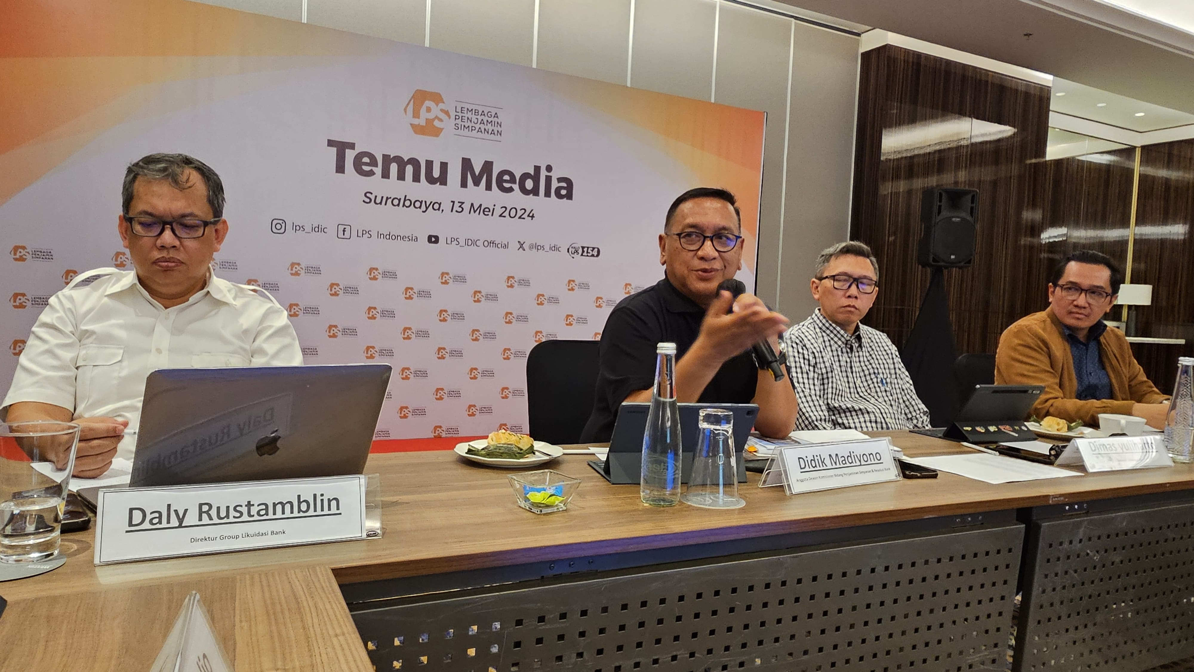Anggota Dewan Komisioner LPS Bidang Program Penjaminan Simpanan dan Resolusi Bank, Didik Madiyono (dua dari Kiri) di Acara Temu Media di Surabaya, Senin (13/5/2024).