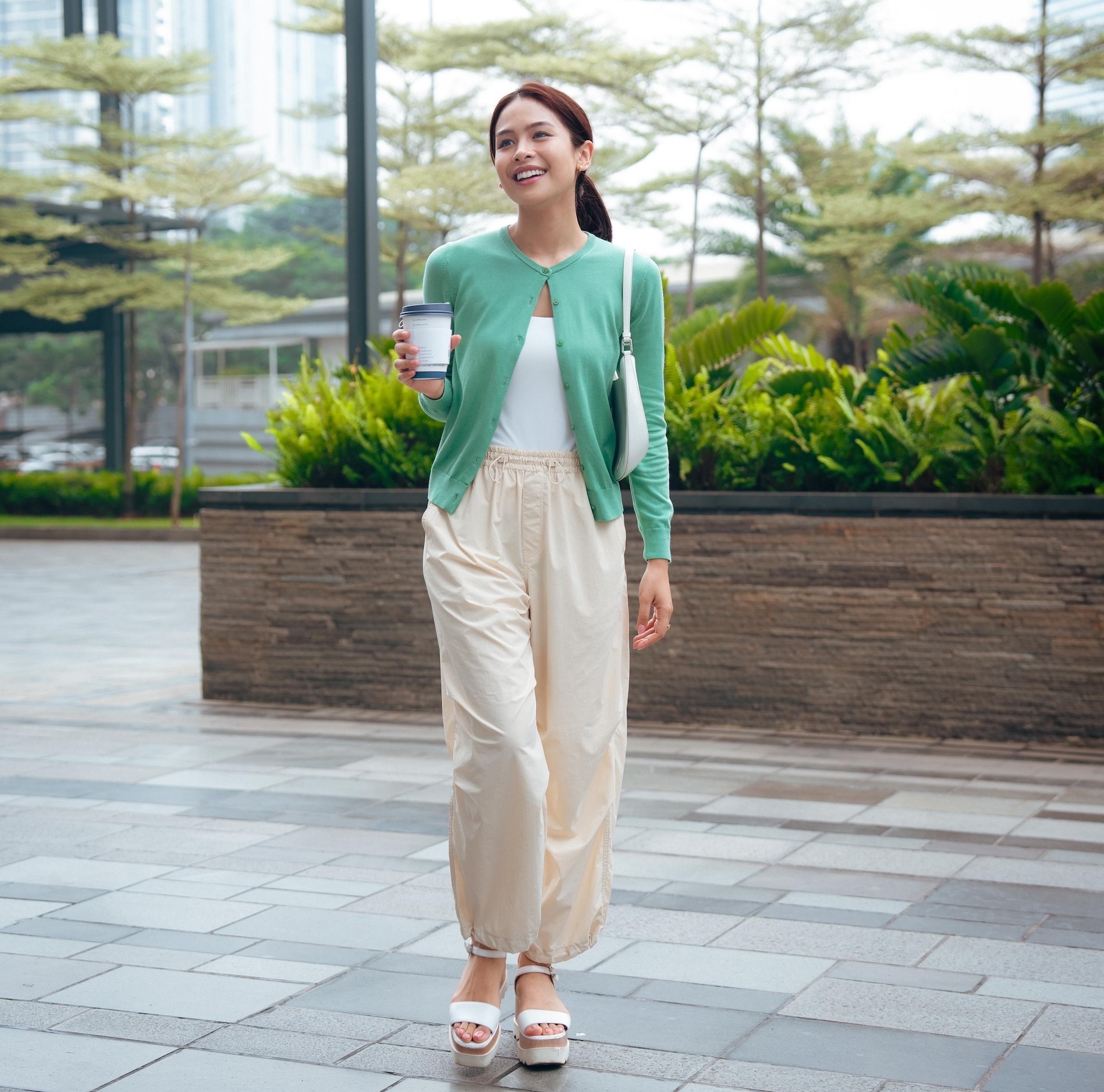 Selain tampil sporty, Maudy juga seringkali terlihat dalam gaya kasual. Kali ini, untuk aktivitas di luar ruangan ia menggunakan AIRism Bra Kamisol putih dan Kardigan Proteksi Sinar UV Kerah Bulat Lengan Panjang berwarna hijau sebagai luaran.