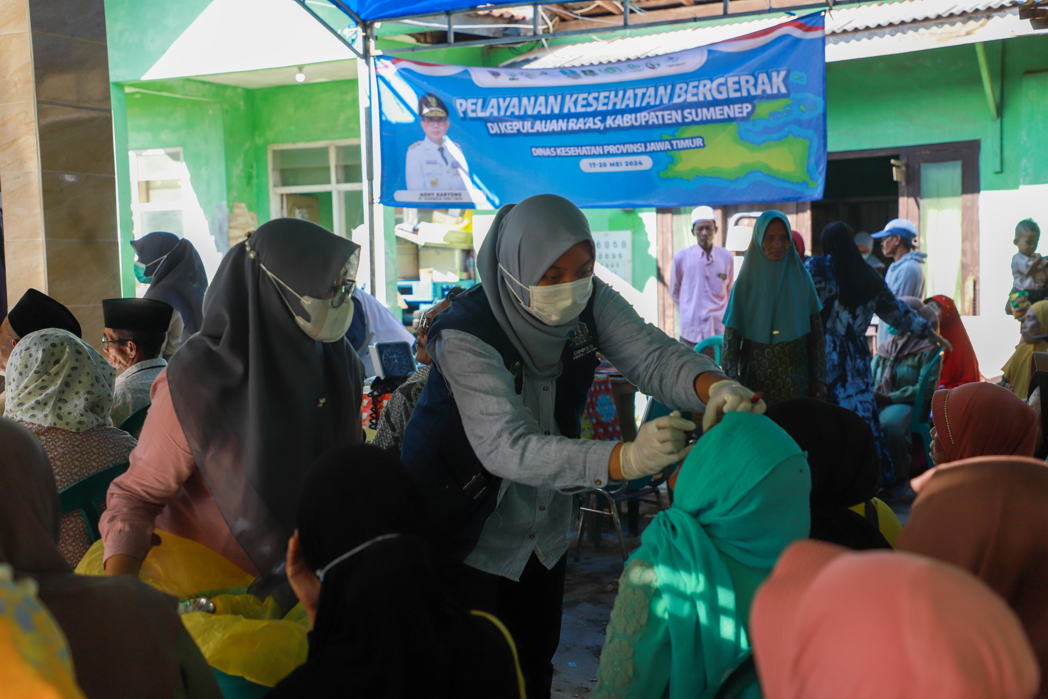 KANALSATU - Pemerintah Provinsi (Pemprov) Jawa Timur melalui Dinas Kesehatan (Dinkes) Provinsi mengirim Tim Pelayanan Kesehatan (Yankes) Bergerak ke Pulau Raas Kabupaten Sumenep, Madura. Tim Yankes Bergerak yang beranggotakan 60 tenaga kesehatan ini memberikan pelayanan pada tanggal 17-20 Mei 2024.