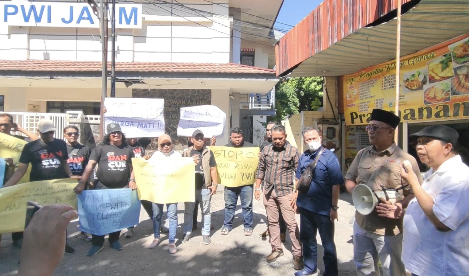 KANALSATU - Puluhan pekerja pers dari berbagai media di Jawa Timur melakukan demontrasi di halaman depan Gedung PWI Jawa Timu di Jl Taman Apsari 15-17, Surabaya.