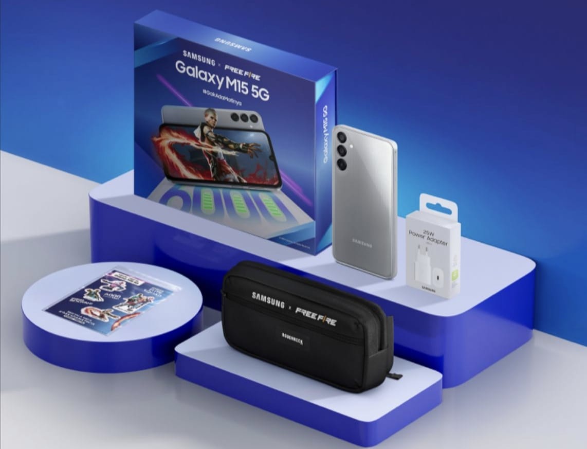Package ini terdiri dari unit Galaxy M15 5G, sling bag eksklusif Samsung x Free Fire, sticker pack Free Fire edition, Free Fire in-game item, dan travel adapter 25W, dengan bonus e-voucher Grabfood Rp 100.000.