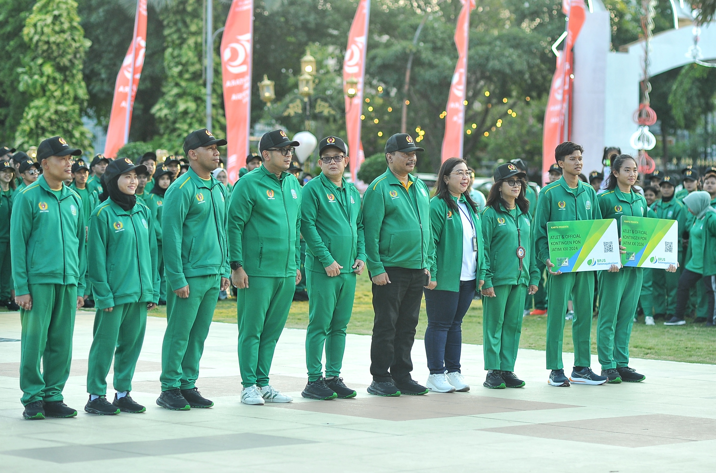 Pelepasan Kontingen Jawa Timur ini sendiri berjalan semarak. Di samping memberikan motivasi, Pj. Gubernur Adhy beserta segenap Forkopimda Jatim, Ketua Perwosi Jatim Arumi Bachsin Emil Dardak, dan para Kepala Perangkat Daerah Pemprov Jatim turut melakukan Flash Mop bersama dengan para atlet. (ega)