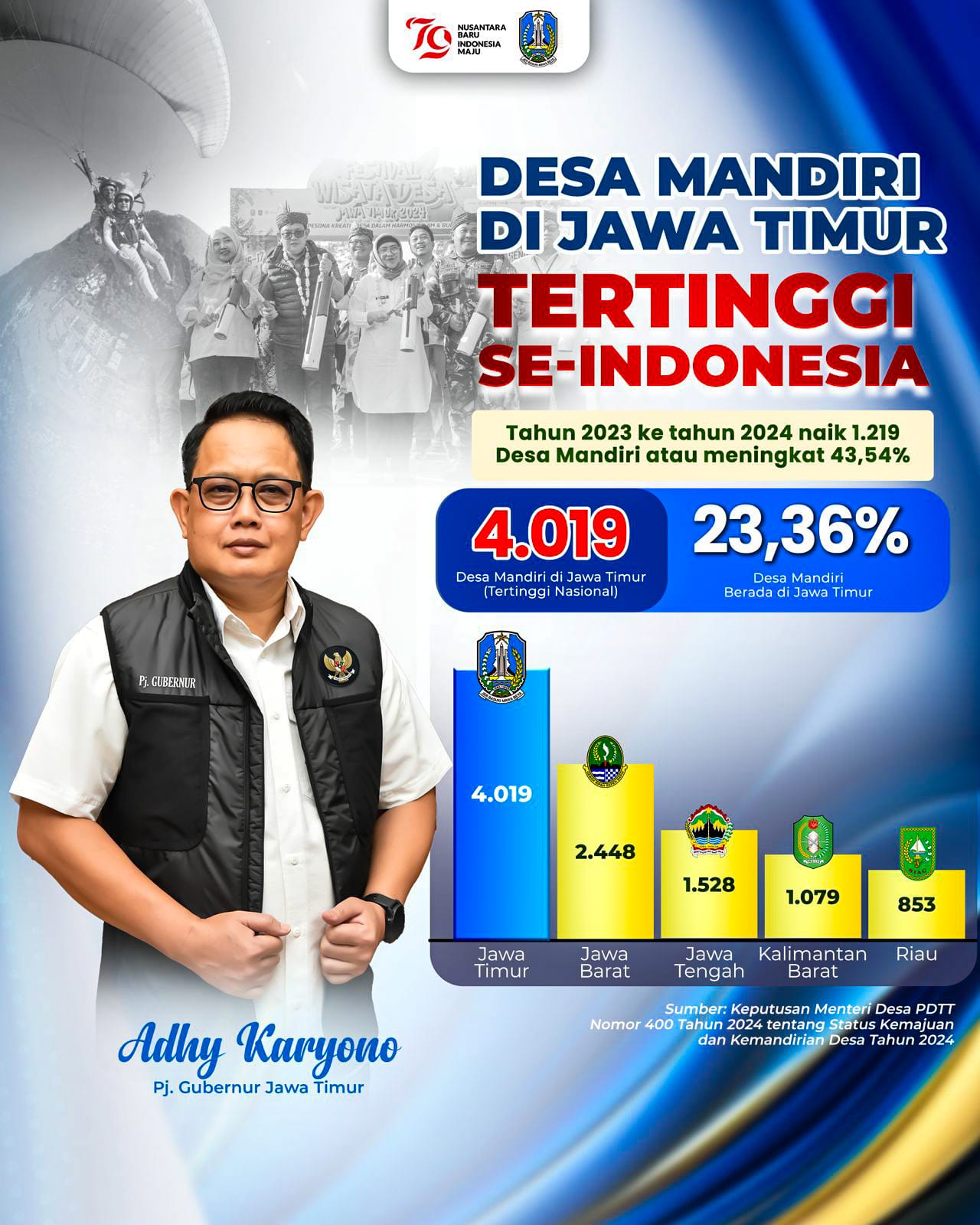 KANALSATU - Keseriusan Pemerintah Provinsi Jawa Timur dalam mendorong kemajuan desa terus membuahkan prestasi. Berdasarkan Keputusan Menteri Desa PDTT No. 400 Tahun 2024, jumlah Desa Mandiri di Jawa Timur melesat mencapai 4.019 desa. Jumlah tersebut merupakan yang tertinggi di Indonesia.