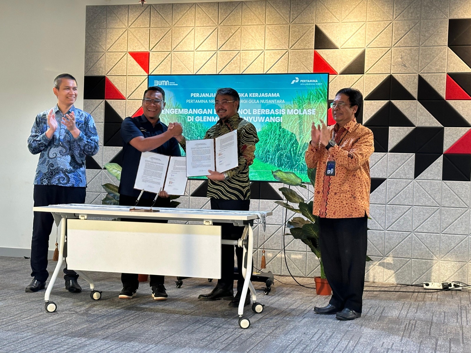 KANALSATU - Direktur Utama PT Sinergi Gula Nusantara SGN anak perusahaan PTPN III Persero Holding Perkebunan, Mahmudi menandatangani Framework Agreement (FA) dengan PT Pertamina Power Indonesia (PNRE) untuk Pembangunan Pabrik Bioethanol di Pabrik Gula Glenmore Banyuwangi, Rabu (4/9/2024) di Jakarta.