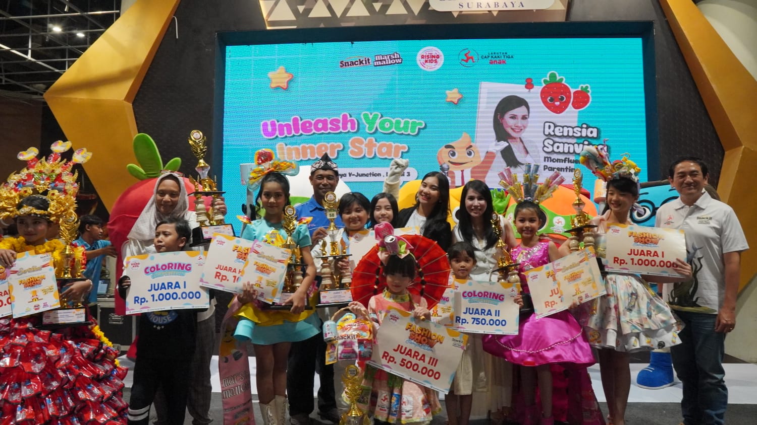 KANALSATU - Kino Indonesia melalui brand Snackit Marshmallow dan Cap Kaki Tiga Anak resmi menutup rangkaian acara lewat Grand Final The Rising Kids Season 3 di Surabaya.