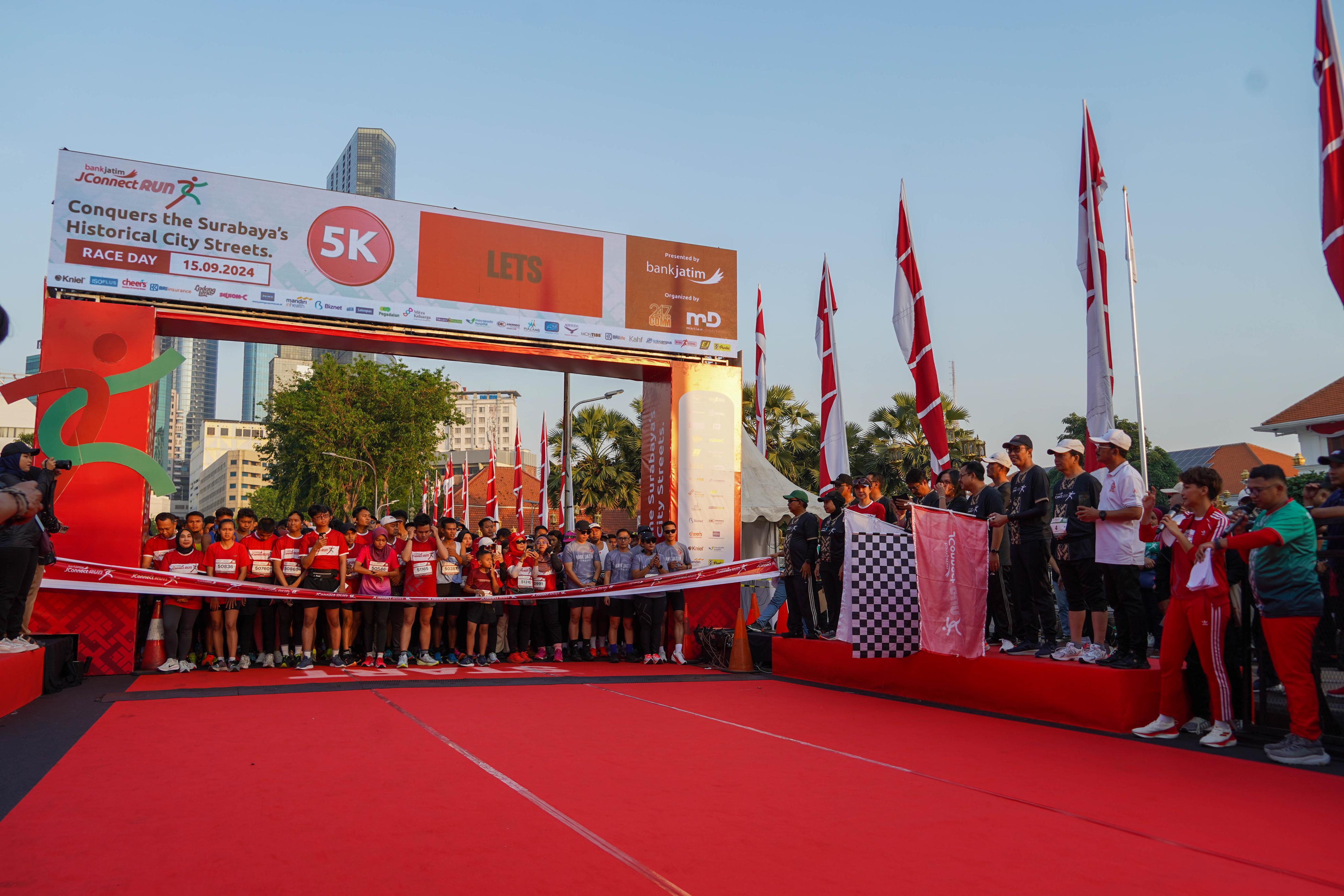 KANALSATU - PT Bank Pembangunan Daerah Jawa Timur Tbk (Bank Jatim) sukses menggelar JConnect Run 2024. Event akbar ini dikuti 3200 pelari dengan berbagai kategori. Mulai dari 5K, 10K, dan 21K dengan start dan finish di Gedung Negara Grahadi.