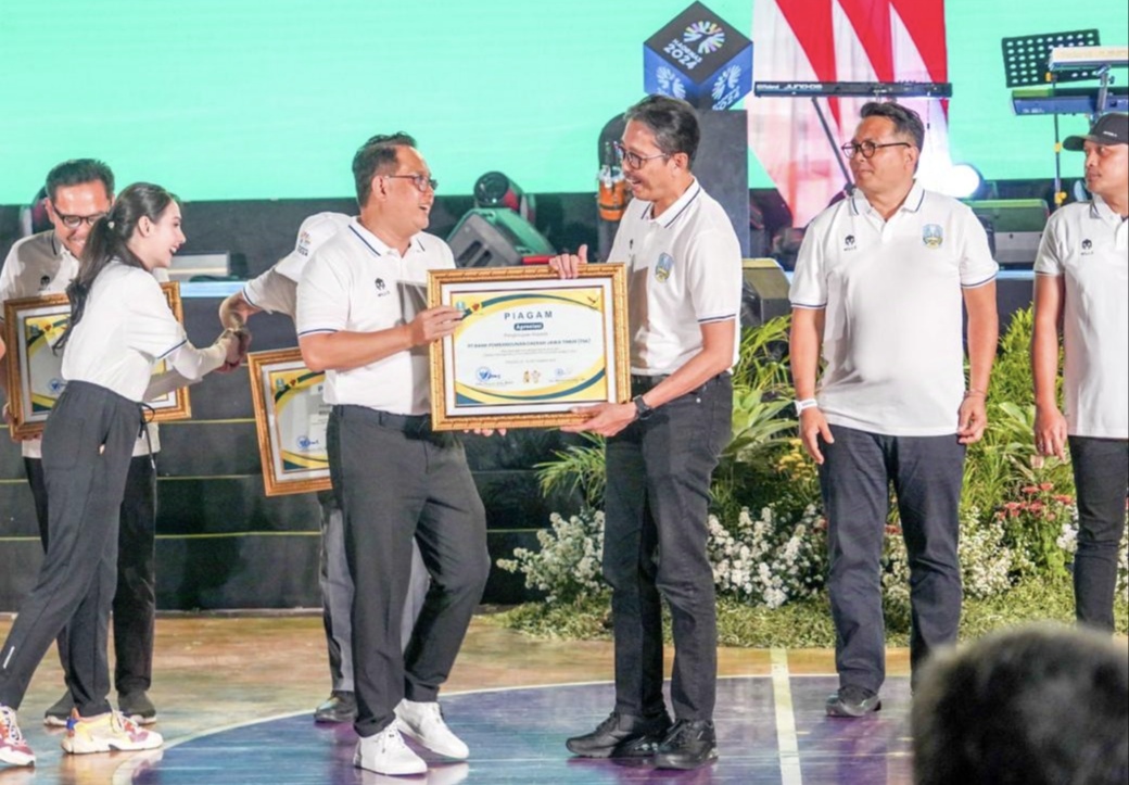 KANALSATU - Berkat dukungan yang konsisten terhadap dunia olahraga, PT Bank Pembangunan Daerah Jawa Timur Tbk (Bank Jatim) meraih apresiasi dari Pemerintah Provinsi Jawa Timur sebagai orang tua asuh bola voli. Penghargaan tersebut diberikan Pj. Gubernur Jawa Timur Adhy Karyono kepada Direktur Utama Bank Jatim Busrul Iman dalam upacara puncak peringatan Hari Olahraga Nasional XLI tahun 2024, Kamis malam (17/10/2024) di GOR CLS Kertajaya Surabaya.