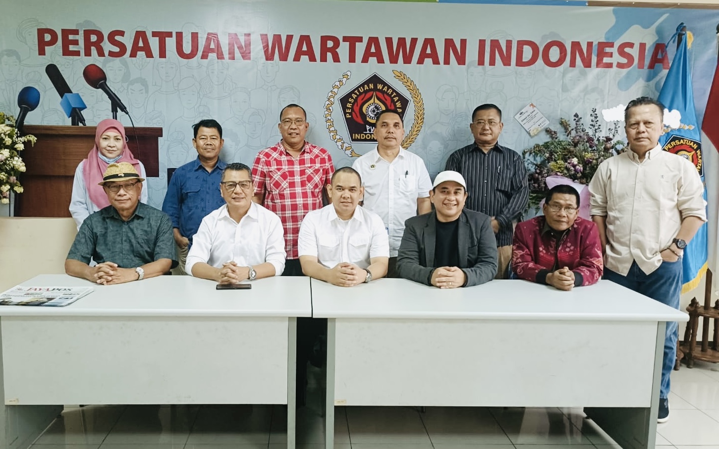 Zulmansyah Sekedang disertai jajaran pengurus teras PWI Jaya membahas acara peluncuran atau kick-off HPN 2025 bersama Kepala Badan Penghubung Provinsi Riau, Ridho Adriansyah, dan Kepala Sub Bidang Pengelola Anjungan Riau di TMII, Zulfikar.