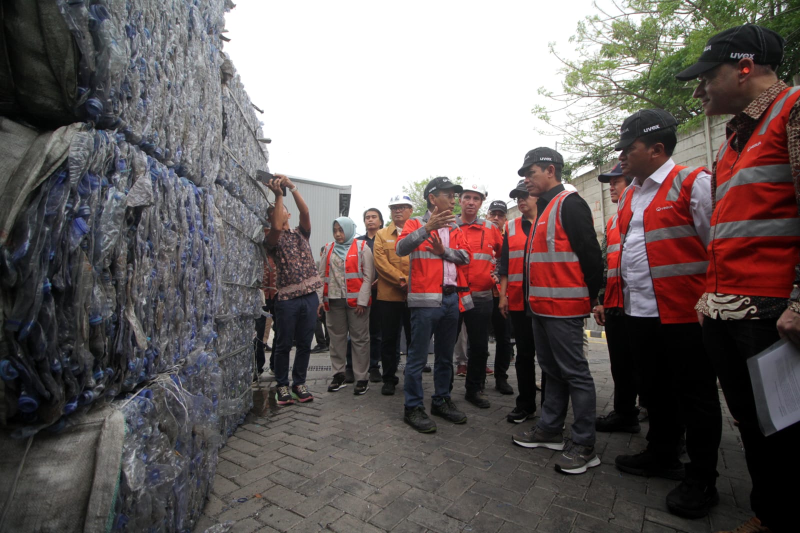 (kedua dari kanan) Menteri Lingkungan Hidup Dr. Hanif Faisol Nurofiq melihat proses pengumpulan kemasan plastik bekas pakai sebelum memulai kunjungan ke Veolia Indonesia.