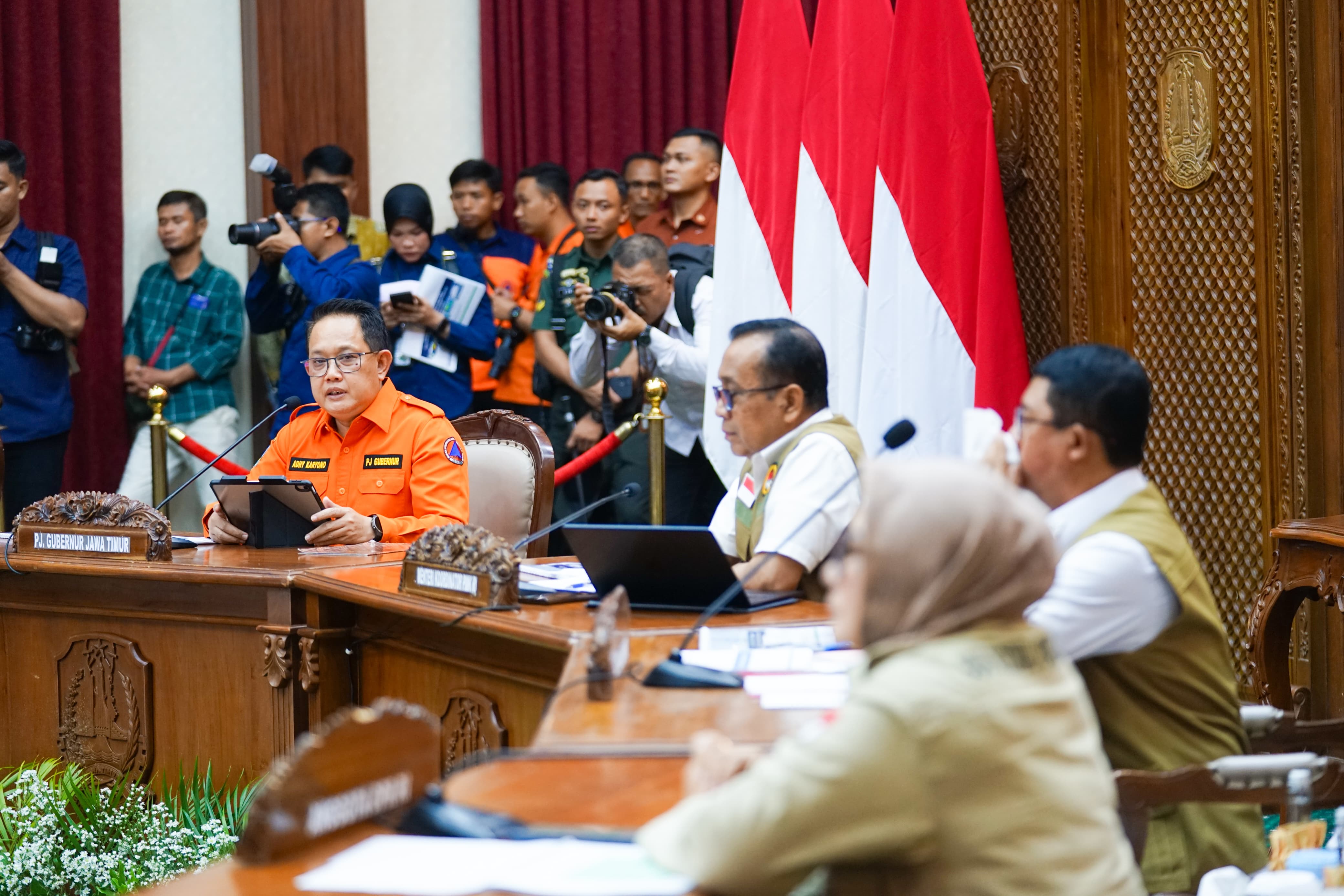 KANALSATU - Penjabat (Pj.) Gubernur Jawa Timur Adhy Karyono menggelar Rapat Koordinasi (Rakor) Siaga Darurat Bencana Hidrometeorologi Tahun 2024 Wilayah Provinsi Jawa Timur di Gedung Negara Grahadi, Surabaya, Selasa (17/12/2024) sore.