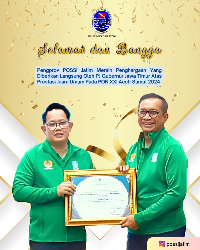 KANALSATU - Keberhasilan atlet selam Jawa Timur (Jatim), meraih hattrick juara umum di Pekan Olahraga Nasional (PON) membuat Pengprov Persatuan Olahraga Selam Seluruh Indonesia (POSSI), mendapatkan penghargaan langsung dari Pj Gubernur Jatim Adhy Karyono.