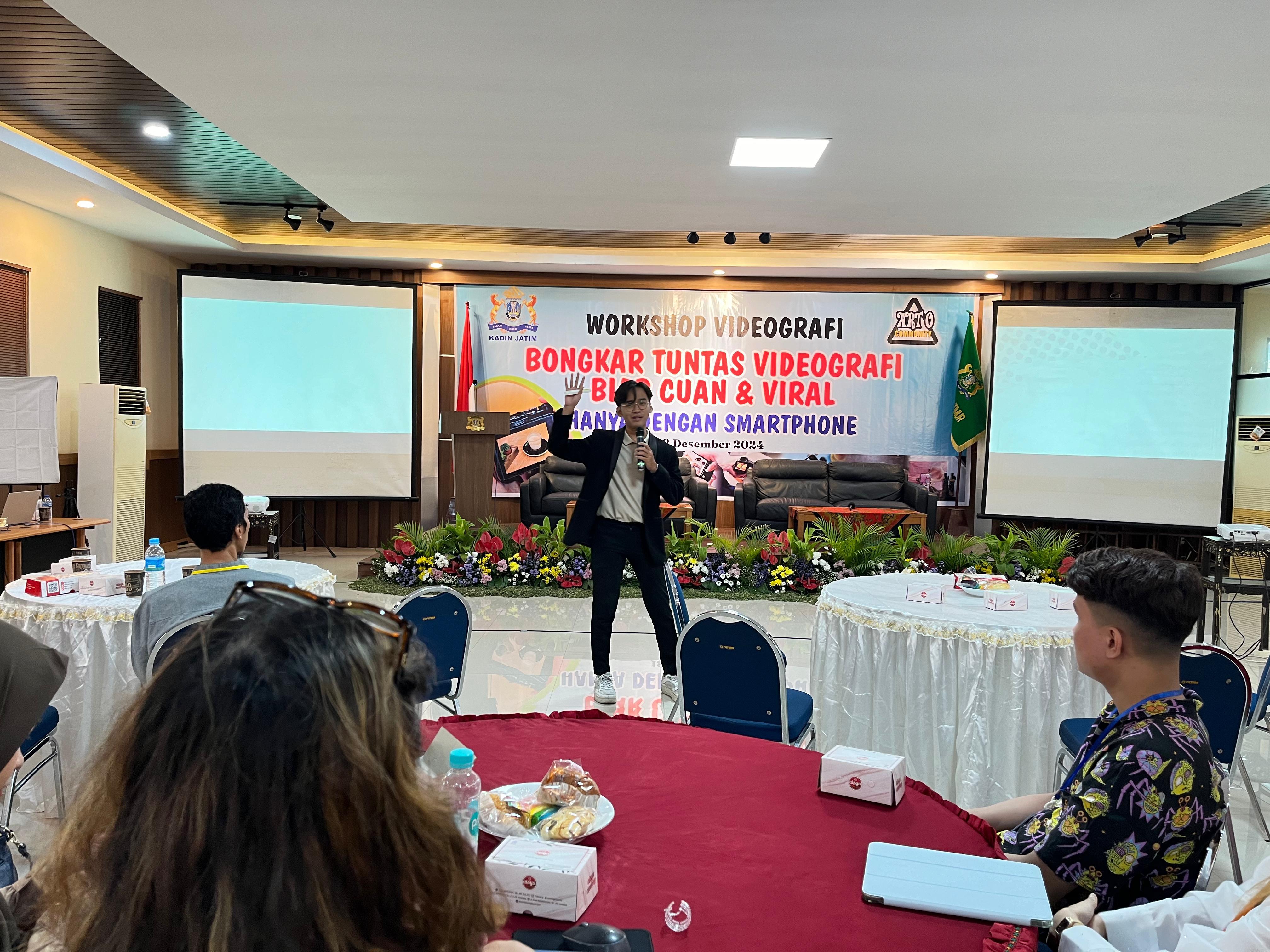James Phillip, salah satu mentor di ArtO Community class yang berpengalaman di bidang videografi, menjadi narasumber utama pada workshop vidoegrafi dengan menggunakan smarphone yang dihadiri pelaku UMKM dan IKM di Graha Kadin Jatim.