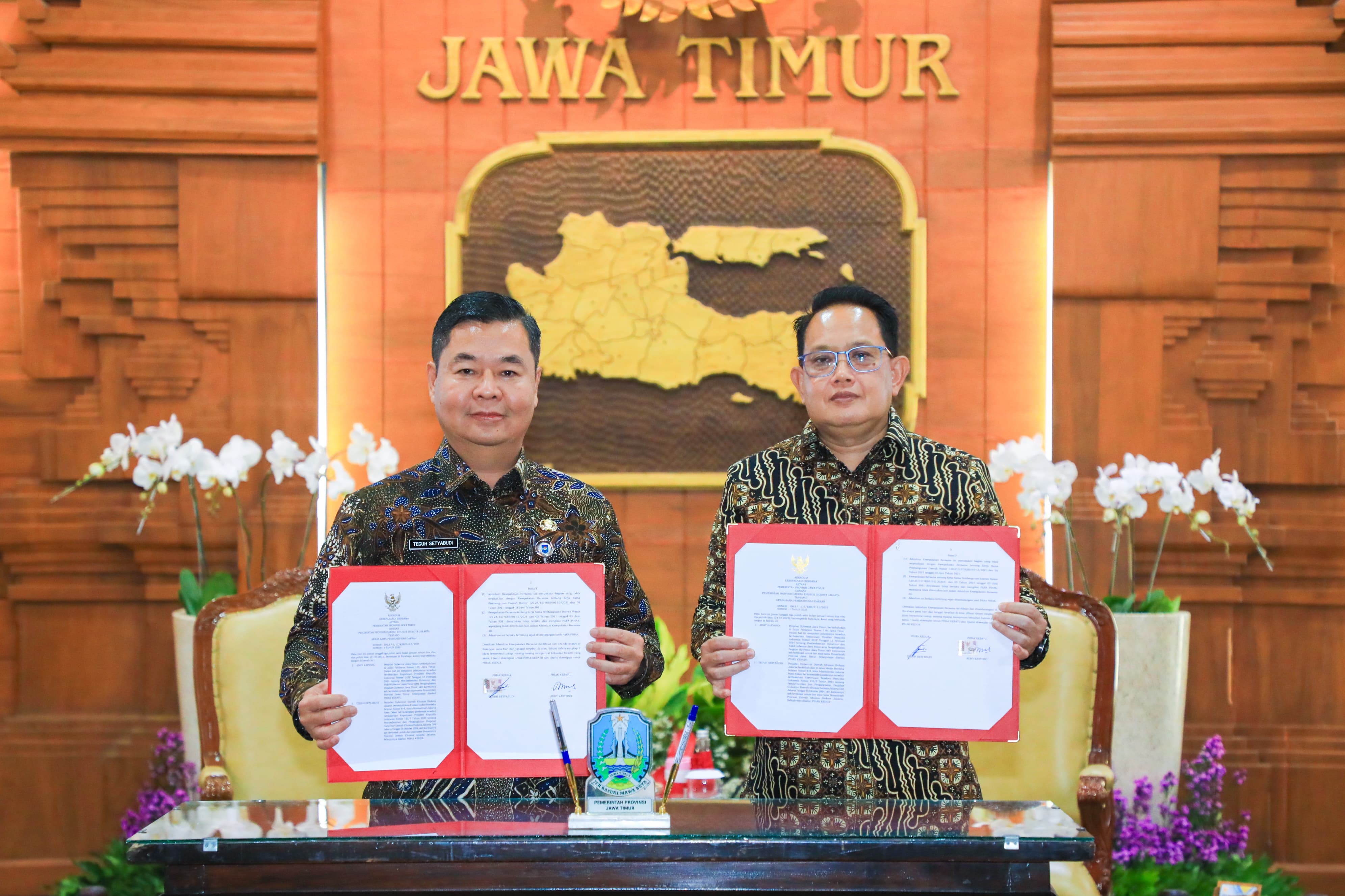 KANALSATU - Pj. Gubernur Jawa Timur, Adhy Karyono, dan Pj. Gubernur DKI Jakarta, Teguh Setyabudi, menandatangani adendum kesepakatan kerja sama antara Pemprov Jatim dan Pemprov DKI Jakarta di Gedung Negara Grahadi, Surabaya, Jumat (31/1/2025). Penyesuaian ini bertujuan untuk memperkuat kolaborasi di berbagai sektor yang telah terjalin sejak 2021 dan akan berakhir pada 2026.