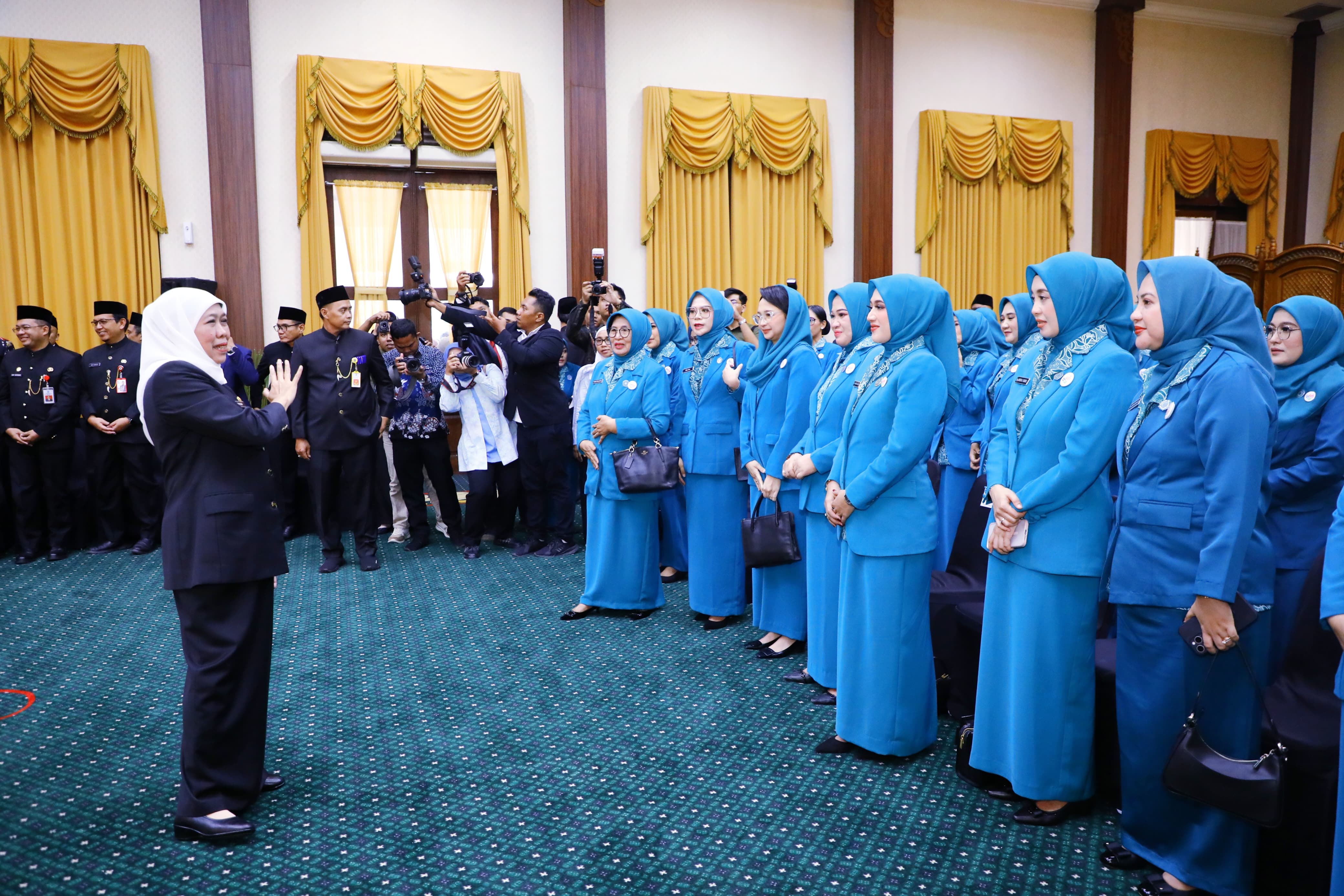KANALSATU - Gubernur Jawa Timur Khofifah Indar Parawansa menghadiri pelantikan Ketua Tim Penggerak PKK dan Ketua Tim Pembina Posyandu Kabupaten/Kota se-Jawa Timur Tahun 2025 di Gedung Negara Grahadi Surabaya, Minggu (2/3/2025).