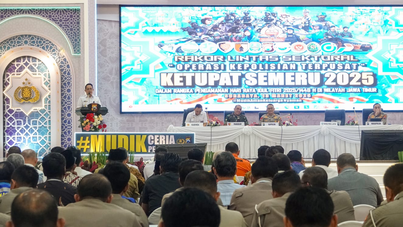 Dalam Rapat Koordinasi Lintas Sektoral Operasi Ketupat Semeru 2025 yang digelar di Gedung Mahameru Mapolda Jatim, Kamis (13/3/2025), Sekdaprov Adhy hadir bersama Kapolda Jatim Komjen Pol Imam Sugianto, Pangdam V Brawijaya Mayjen TNI Rudi Saladin, serta seluruh Forkopimda dan Kapolres se-Jawa Timur.