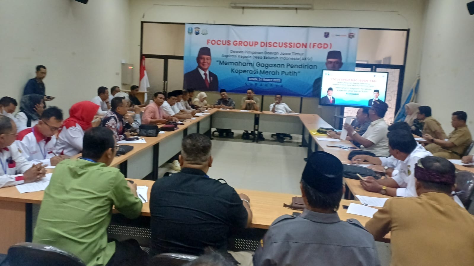 KANALSATU - Aspirasi Kepala Desa Seluruh Indonesia (AKSI) Provinsi Jawa Timur menggelar Focus Group Discussion (FGD) untuk mendukung pendirian Koperasi Desa Merah Putih.