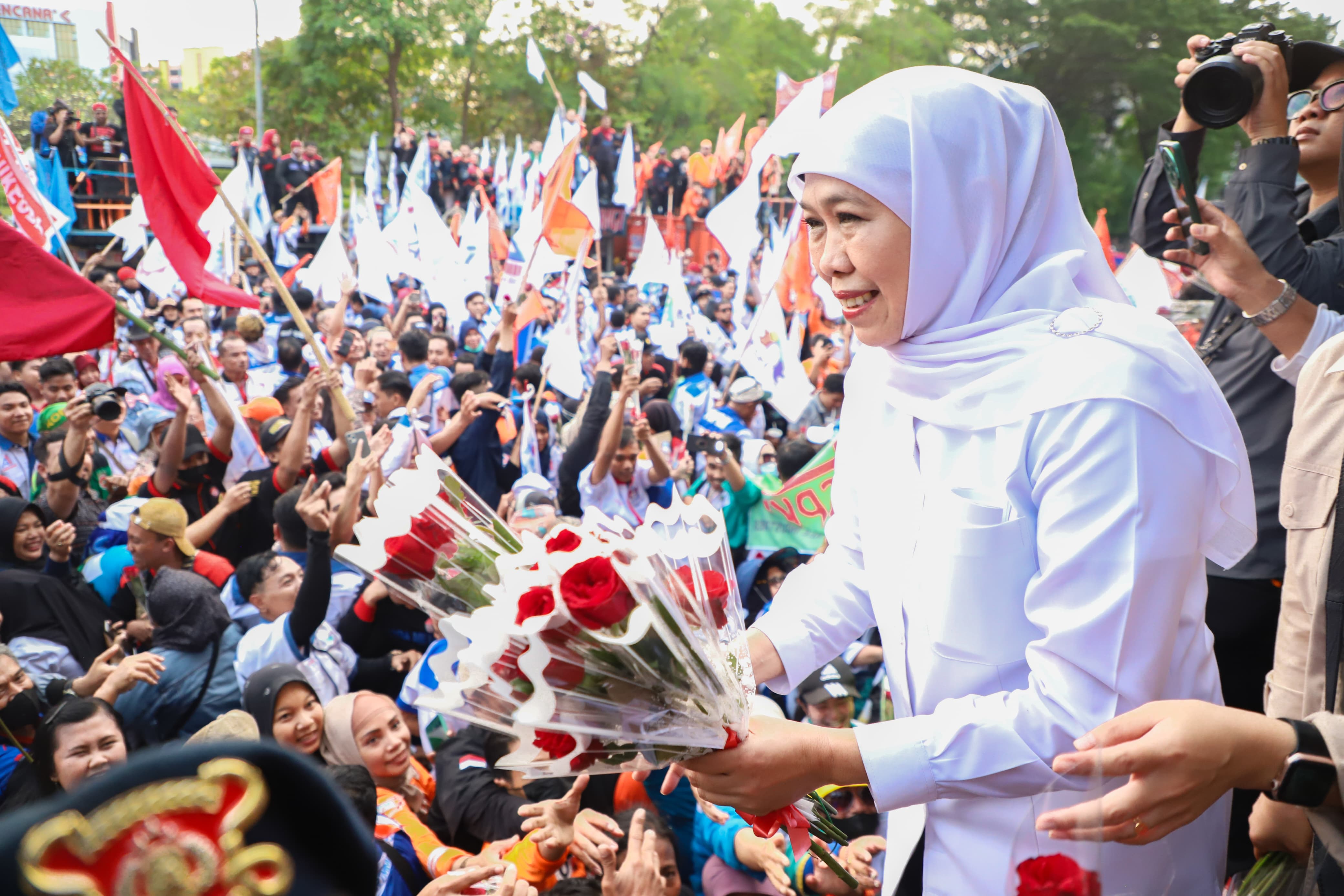 Khofifah menyampaikan terima kasih atas kondusivitas acara May Day dan menegaskan komitmennya terhadap kesejahteraan buruh di Jawa Timur. Ia juga memberikan apresiasi kepada aparat keamanan dan serikat pekerja atas kelancaran peringatan May Day.
