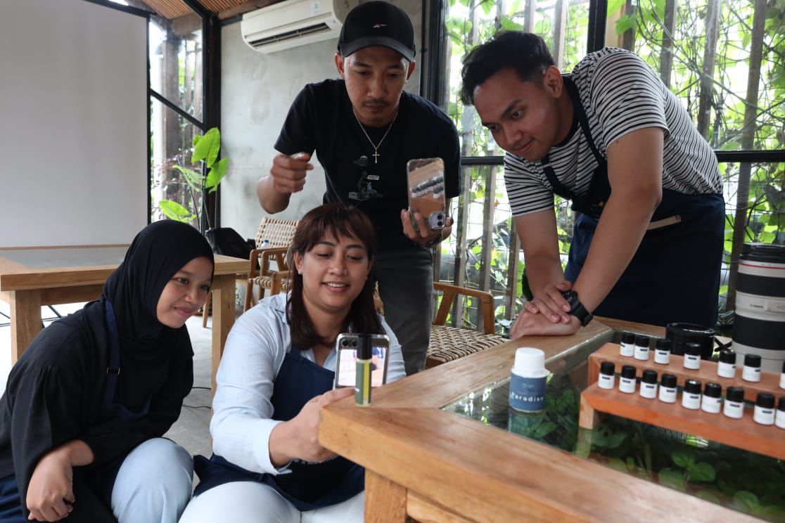 Pelatihan ini tidak hanya memfasilitasi pemahaman teori, tetapi juga mendorong peserta langsung mempraktikkan ilmu yang dipelajari. Mereka diajak mengeksplorasi teknik memotret produk dengan memanfaatkan lingkungan sekitar sebagai latar, tanpa perlu alat bantu mahal.