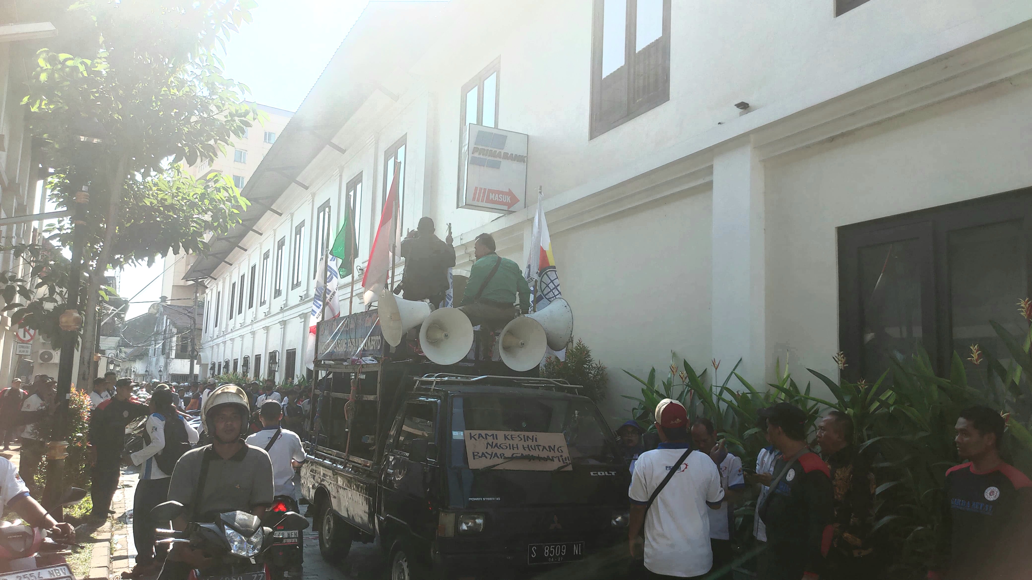 Buruh dan Manejemen saat demo tuntut PT BPR Prima Master Bank segera mencairkan gaji