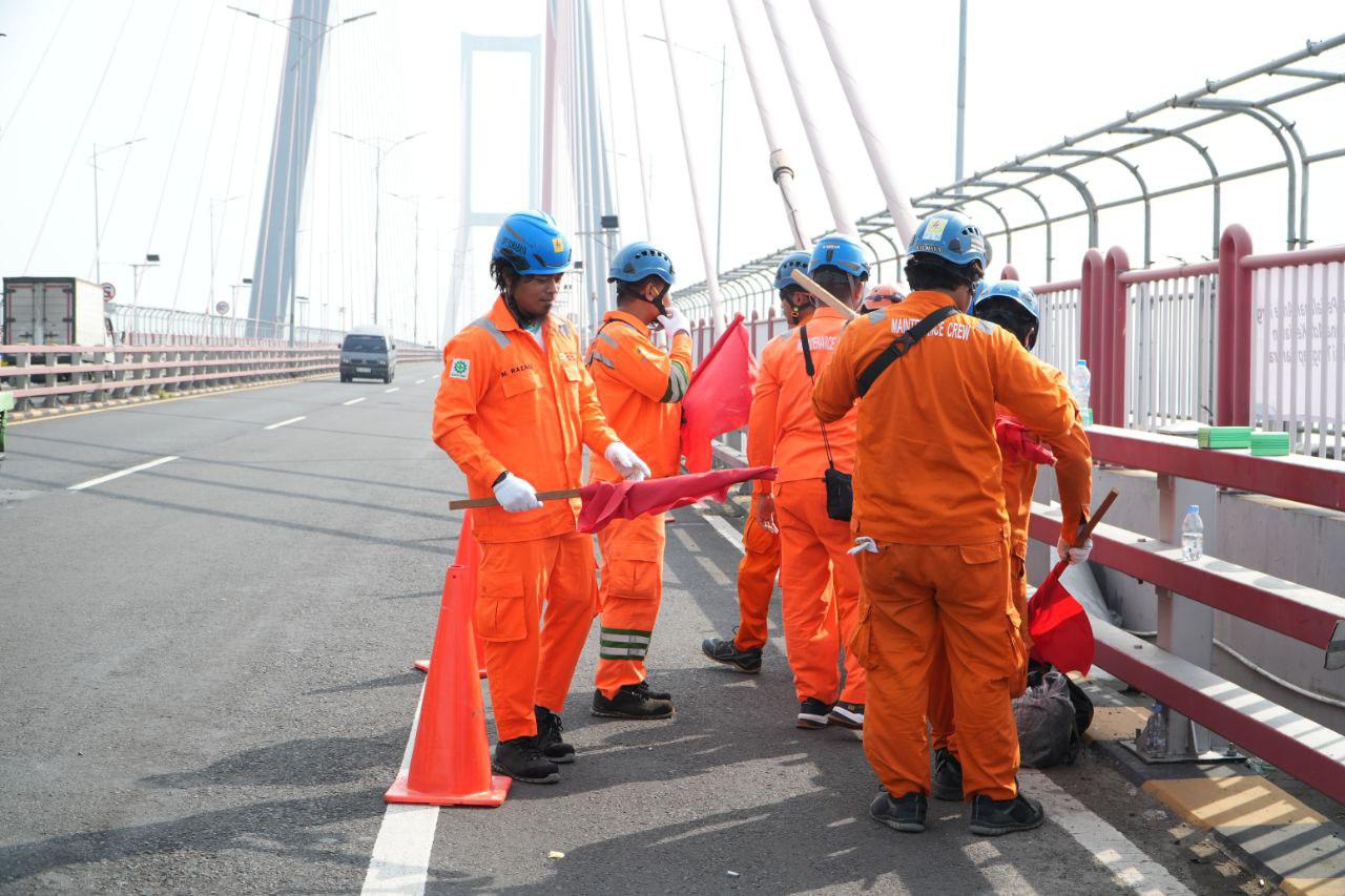 KANALSATU - PLN Unit Induk Transmisi Jawa Bagian Timur dan Bali (UIT JBM) menggelar Simulasi Tanggap Darurat Pengamanan Saluran Kabel Tegangan Tinggi (SKTT) yang membentang di sepanjang jembatan Suramadu, Kamis (19/6/2025).
