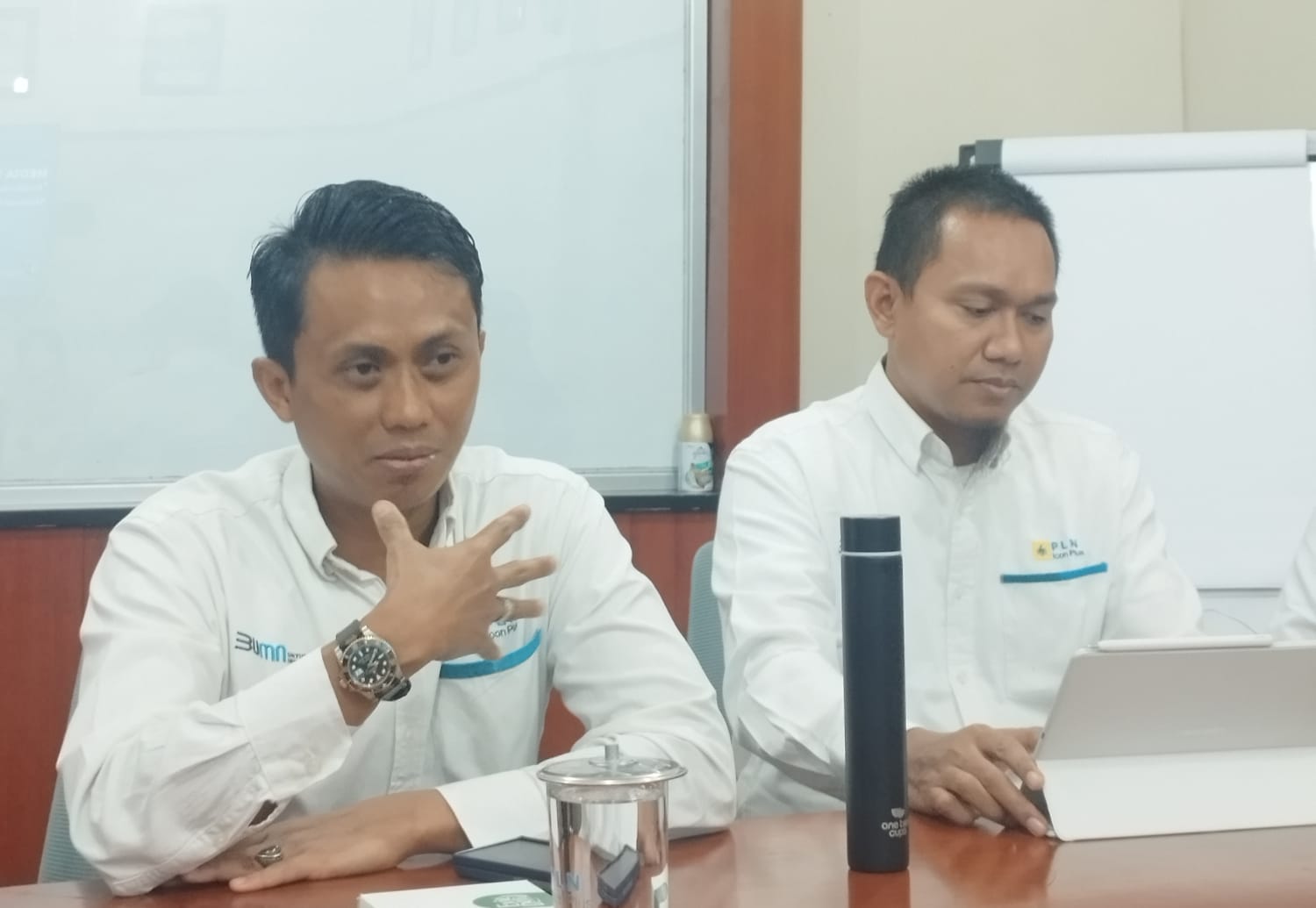 General Manager PLN Icon Plus SBU Regional Jawa Bagian Timur, Rory Aditya (Kiri) bersama Manajer Pemasaran dan Penjualan Enterprise Eko Candra saat Media Visit, Senin (7/7/2025) di Surabaya.