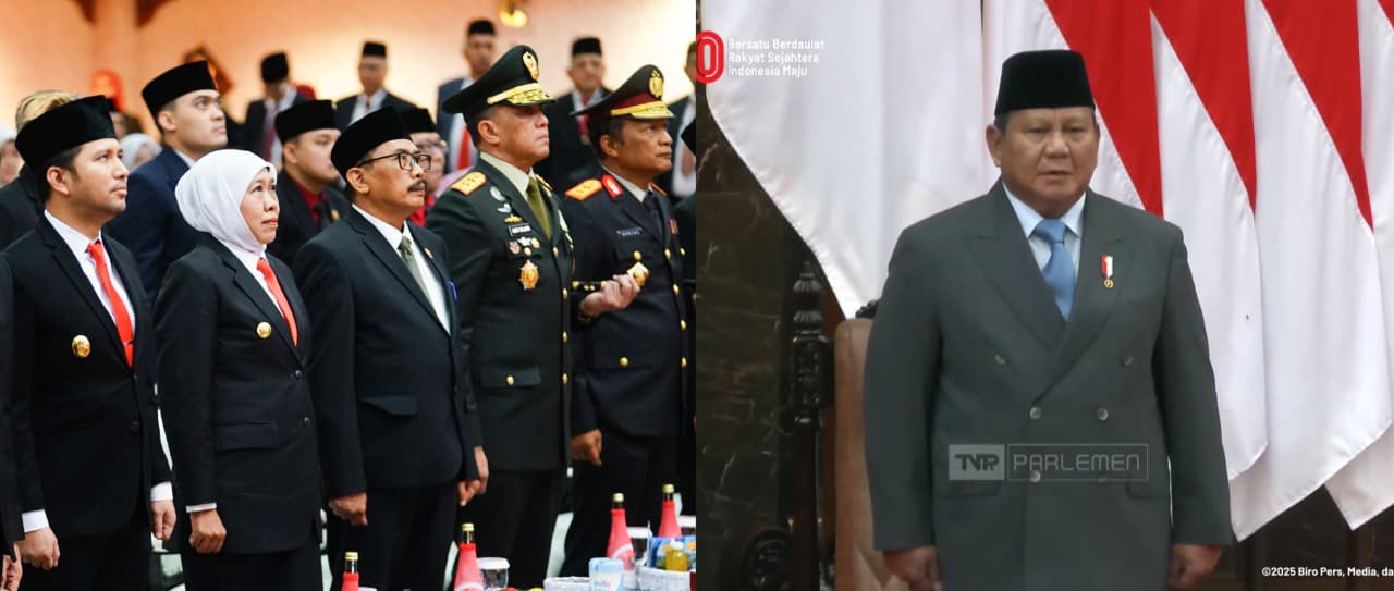 KANALSATU - Gubernur Jawa Timur Khofifah Indar Parawansa menggarisbawahi pidato kenegaraan Presiden Republik Indonesia Prabowo Subianto dalam rangka peringatan Hari Ulang Tahun (HUT) ke-80 Republik Indonesia, yang disimak bersama di DPRD Provinsi Jatim, Jumat (15/8/2025).