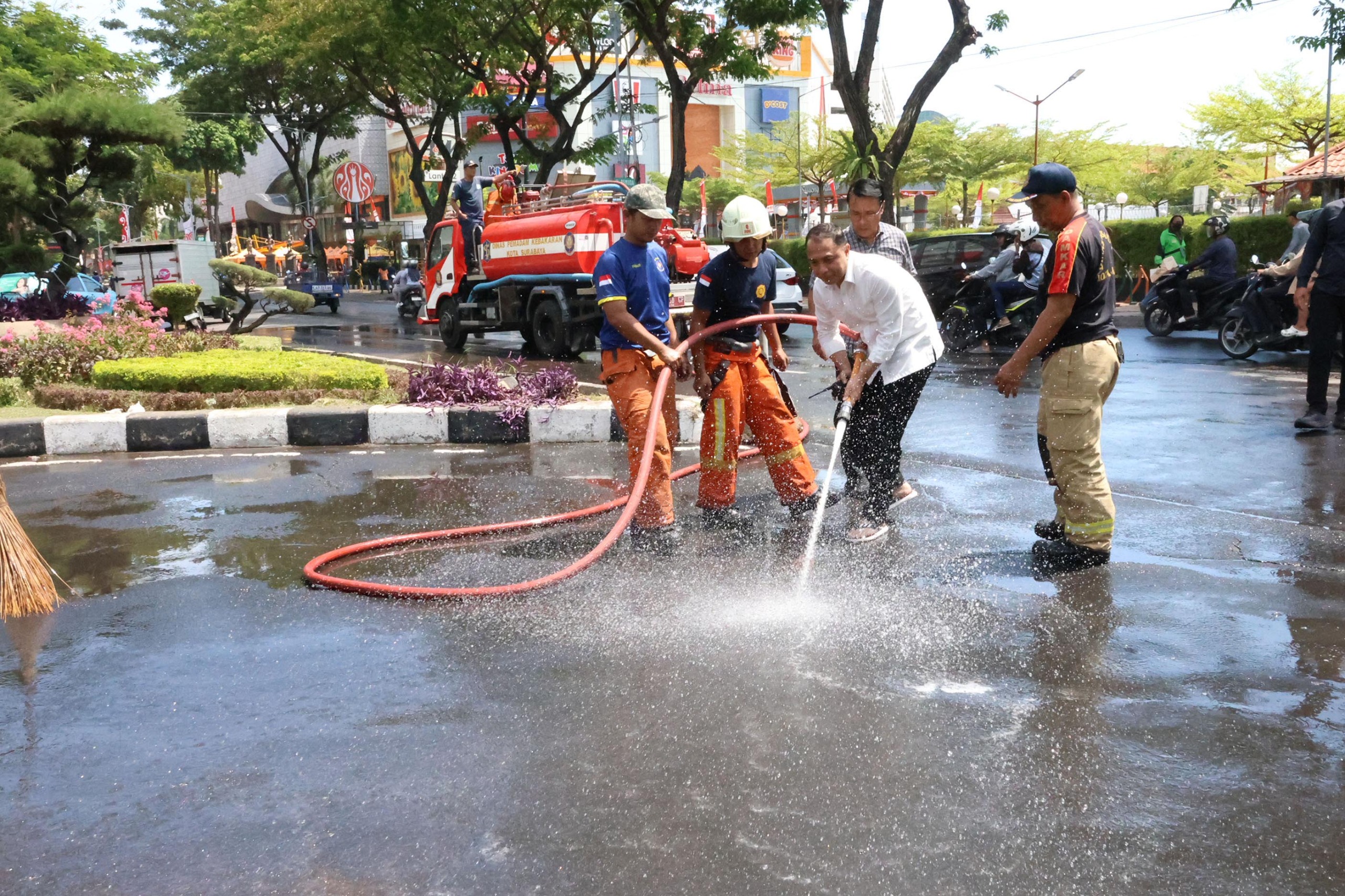 Didampingi jajaran Pemkot dari Dinas Lingkungan Hidup (DLH), Dishub, Dinas Pemadam Kebakaran dan Penyelamatan (DPKP), serta Dinas Sumber Daya Air dan Bina Marga (DSDABM), Eri bahkan ikut memegang selang air untuk membersihkan material sisa demo.
