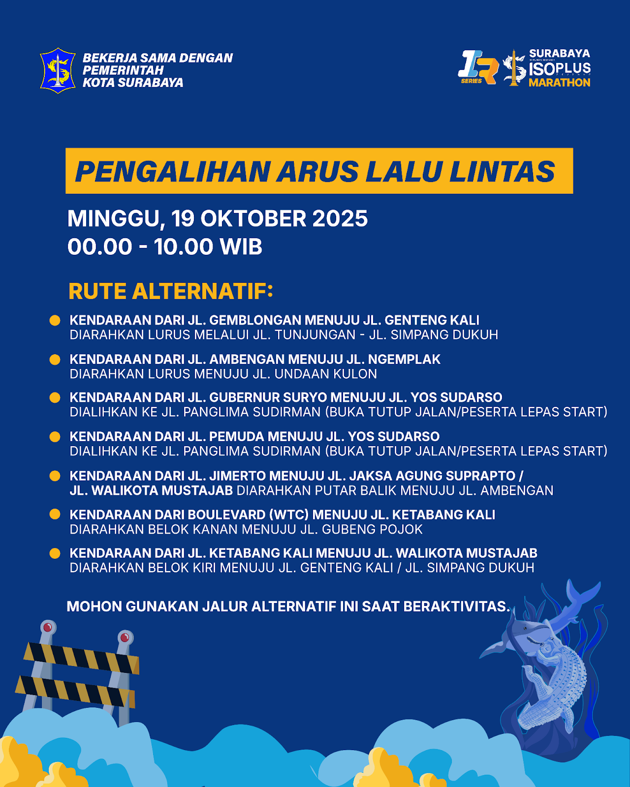 Kabid Wasdal (Pengawasan dan Pengendalian) Dinas Perhubungan Kota Surabaya Hanang Prasetyo, mengatakan, pihaknya bersama penyelenggara dan kepolisian akan melakukan pengalihan arus lalu lintas di beberapa titik mulai pukul 00.00 hingga 10.00 WIB pada hari Minggu, 19 Oktober 2025. Masyarakat diimbau untuk menyesuaikan agenda di jam tersebut, dan menggunakan jalan alternatif agar lalu lintas tetap kondusif.