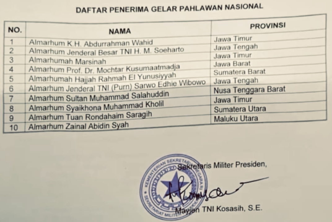 Berikut daftar 10 tokoh yang diberikan gelar pahlawan nasional hari ini: