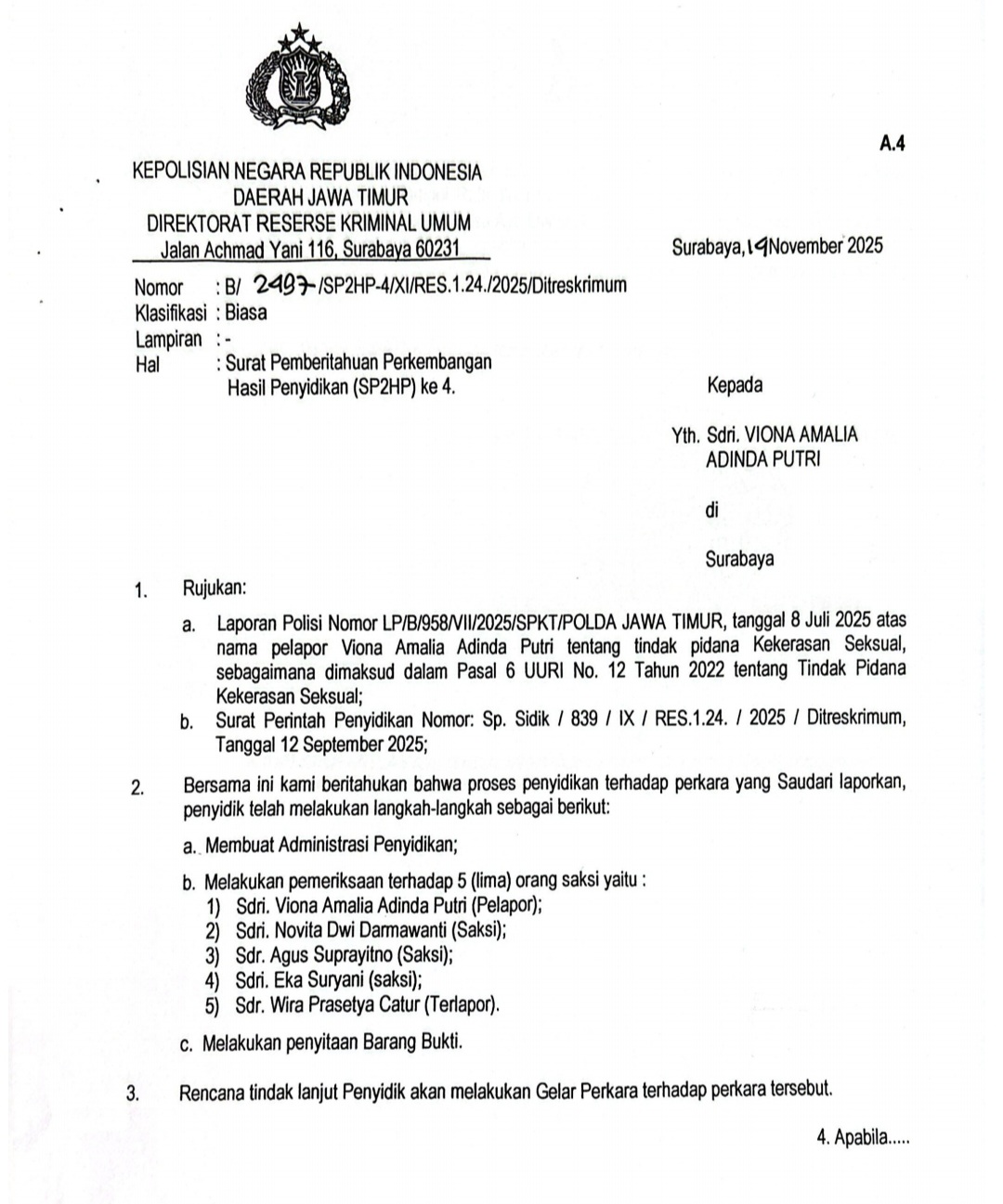 Berdasarkan dokumen Surat Pemberitahuan Perkembangan Hasil Penyelidikan (SP2HP), laporan dugaan pelecehan dan kekerasan seksual yang melibatkan Wira Prasetya Catur telah diterima dan diproses oleh pihak kepolisian, sebagaimana dilaporkan oleh Sdri Viona Amalia Adinda Putri. Status perkara tersebut masih dalam tahap penyelidikan.