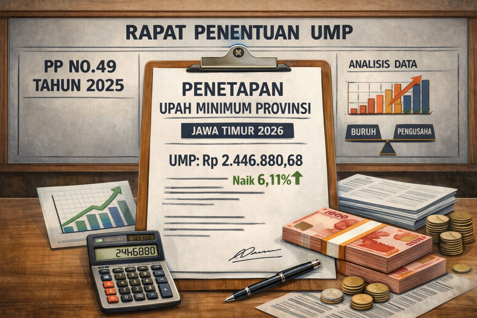 KANALSATU - Upah Minimum Provinsi (UMP) Jawa Timur tahun 2026 resmi mengalami kenaikan sebesar 6,11 persen. Dengan penyesuaian tersebut, UMP Jatim 2026 ditetapkan menjadi Rp2.446.880,68.