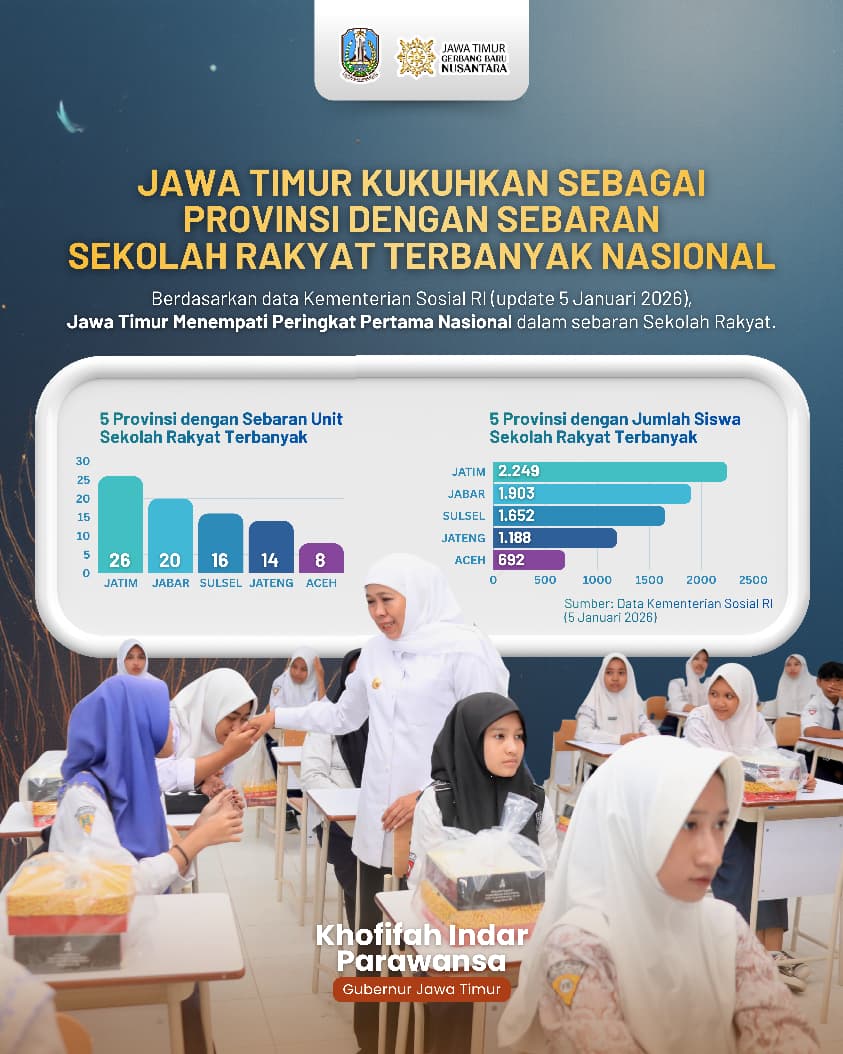 Dari total 166 Sekolah Rakyat yang diresmikan pemerintah pusat, Jawa Timur menyumbang porsi terbesar dengan 26 titik. Jumlah tersebut melampaui provinsi lain seperti Jawa Barat yang memiliki 20 titik, Sulawesi Selatan 16 titik, Jawa Tengah 14 titik, dan Aceh sebanyak 8 titik.