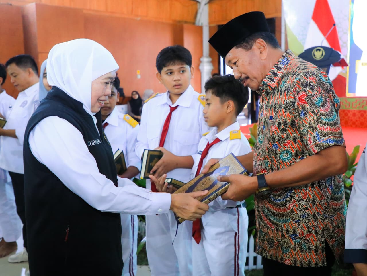 KANALSATU – Gubernur Jawa Timur Khofifah Indar Parawansa membagikan Al-Quran Mushaf Madinah hadiah dari Raja Arab Saudi Salman bin Abdulaziz Al Saud kepada masyarakat di berbagai daerah di Jawa Timur sepanjang Ramadan 2026. Pembagian mushaf tersebut dilakukan dalam rangkaian kegiatan Sapa Bansos Amaliyah Ramadan yang digelar Pemerintah Provinsi Jawa Timur.