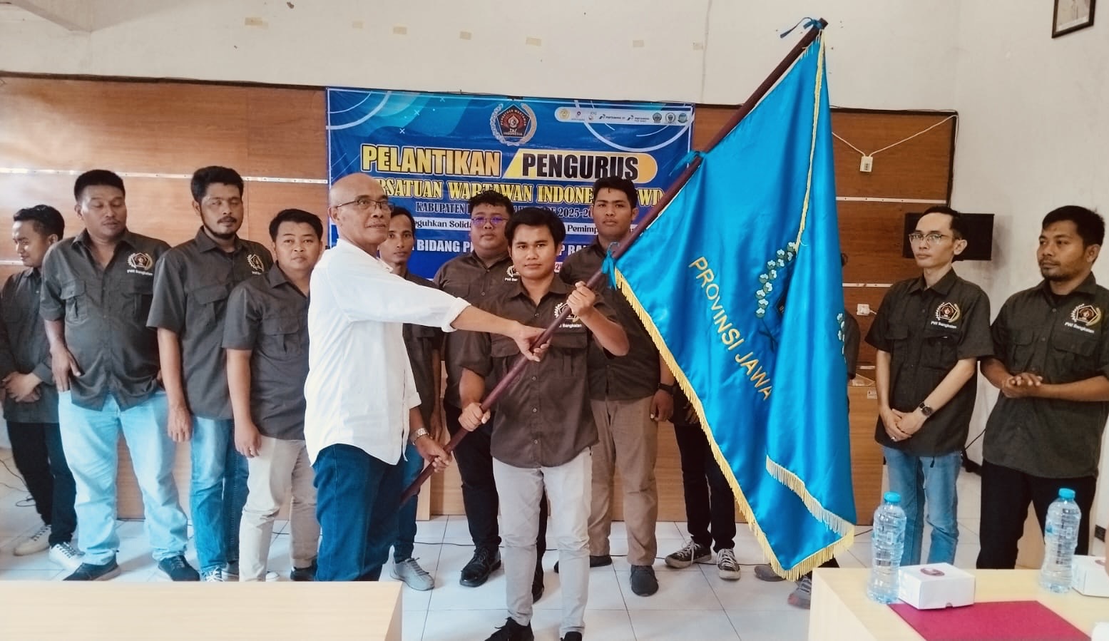 BANTUAN DARURAT: Foto bersama dengan tim pendistribusian bantuan darurat tahap I untuk wartawan terdampak bencana…